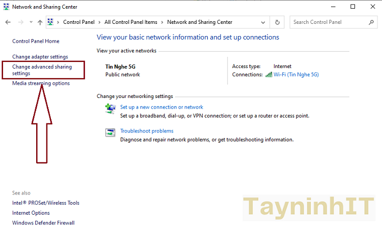 - Bước 6: Sau đó nhấp vào mục “Change advanced sharing settings” ở danh mục bên trái tại cửa sổ mới.