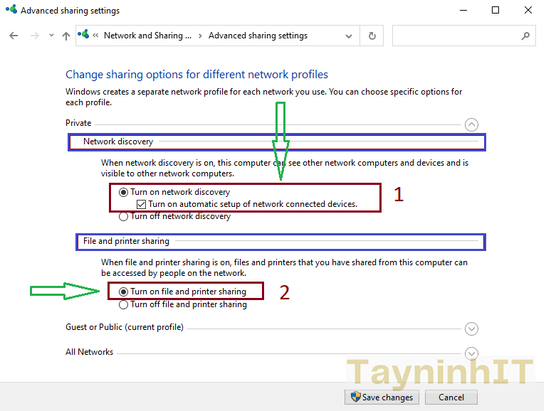 + File and printer sharing: tích để chọn "Turn on file and printer sharing"