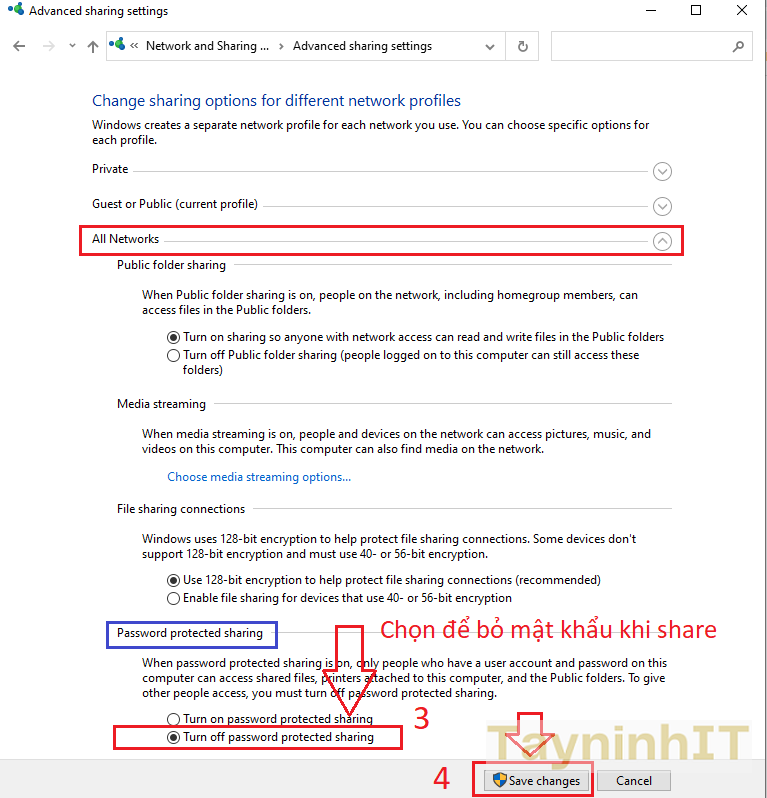 Sau đó kéo xuống tìm phần "All Networks" tìm mục “Password protecting sharing” và tích chọn Turn off password protected sharing => bấm Save changes để lưu lại.(Khi chọn Turn on thì các máy con truy cập vào máy sẽ phải nhập mật khẩu)