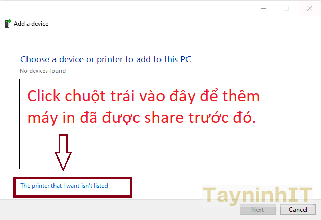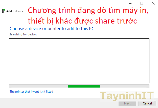- Bước 3: Khi cửa sổ quét thiết bị mở ra bạn click vào dòng “The printer that I want isn’t listed” bên dưới ô trống để tìm kiếm thiết bị ở máy khác.
