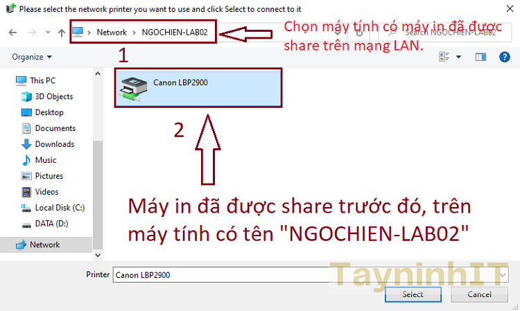 - Bước 5: Nhấp chuột vào máy tính có share máy in => nhấp tiếp vào máy in được chia sẻ từ máy đó => chọn Select để máy tính bắt đầu quét và cài driver cho máy in đó nếu máy chưa được cài đặt.