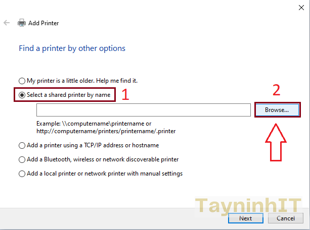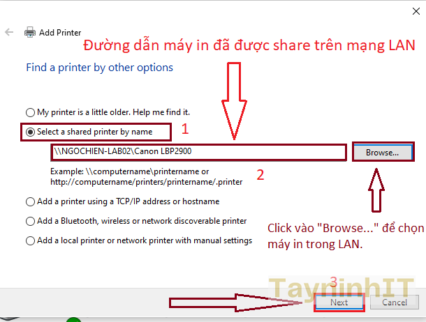 - Bước 4: Tại cửa sổ tiếp theo bạn nhấp chuột vào mục “Select a shared printer by name” => click chuột và ô Browse để tìm các máy trong mạng LAN.