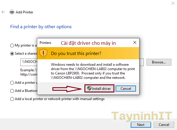 - Bước 6: Xác nhận và chờ máy tính cài driver máy in
