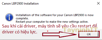 Sau khi cài đặt xong driver máy in thì máy tính bạn sẽ được yêu cầu restart để máy tính nhận máy in, nhấn "OK" để tiếp tục