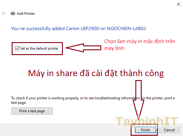- Bước 7: Sau khi đã cài đặt driver bạn bấm “Next" và "Finish” là có thể hoàn thành việc kết nối máy tính với máy in thông qua mạng LAN.