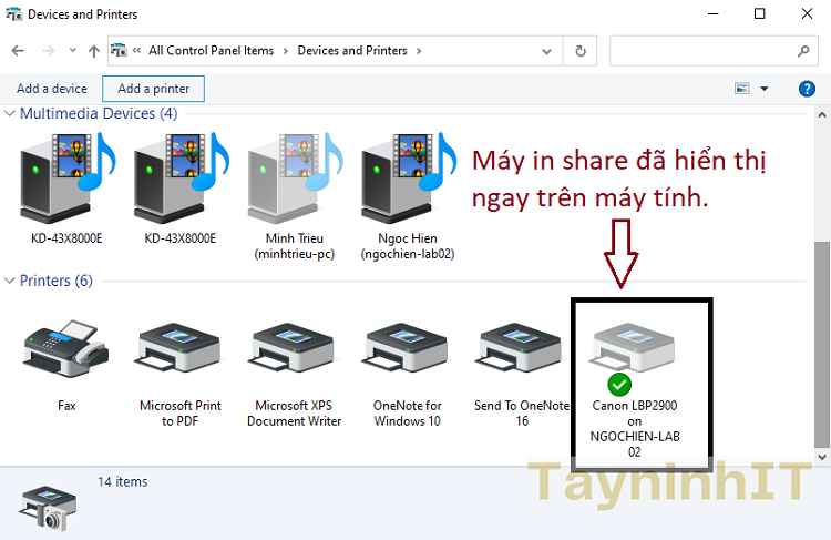 Thành quả đạt được sau khi cài đặt thành công là máy in chia sẻ kết nối vừa rồi sẽ hiển thị trong phần "Device and Printers" của máy bạn