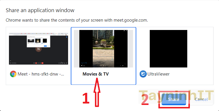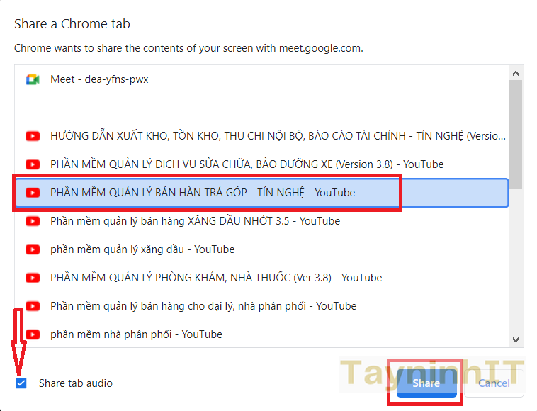 - Bước 2: Lúc này hiển thị các tab trên trình duyệt, bạn nhấn vào tab có âm thanh muốn chia sẻ > Chia sẻ