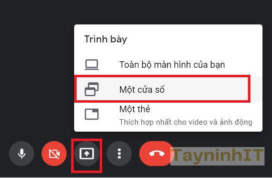 - Bước 2: Sau đó, bạn click vào tùy chọn biểu tượng hình chữ nhật có mũi tên bên trong ở thanh công cụ trong màn hình cuộc họp và chọn A window (Một cửa sổ)
