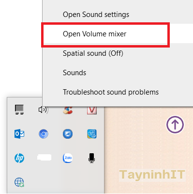 - Bước 2.1: Tại giao diện trên máy tính bạn nhấn vào biểu tượng loa rồi chọn Open Volume mixer.