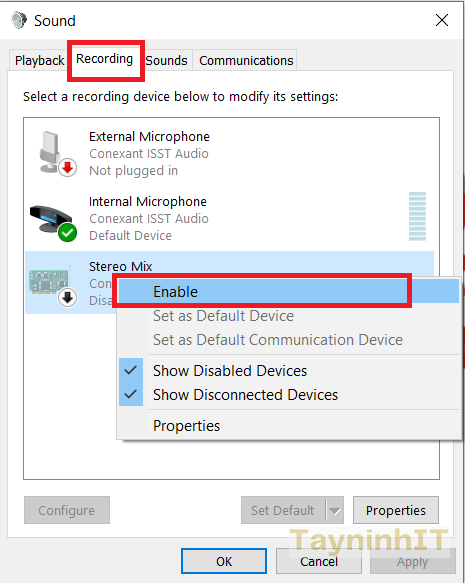 - Bước 2.3: Hiển thị giao diện Sound nhấn vào mục Recording. Lúc này bạn sẽ nhìn thấy mục Stereo Mix rồi nhấn chuột phải chọn Enable để kích hoạt.