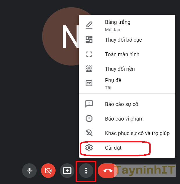 Tại giao diện trên Google Meet chúng ta nhấn vào biểu tượng 3 chấm > Cài đặt.