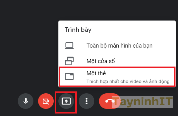 - Bước 1: Tại giao diện trên Google Meet, nhấn và biểu tượng ô vuông có mũi tên đi lên rồi chọn Một thẻ để chia sẻ video hay âm thanh có tiếng.