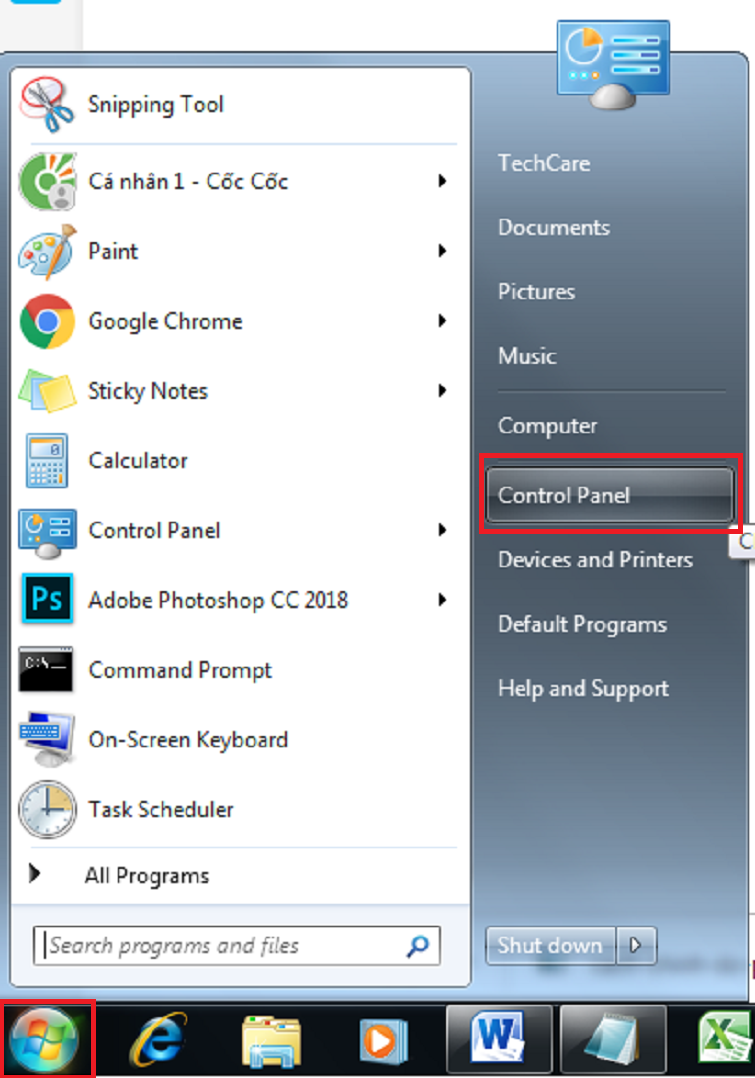- Bước 1: Đầu tiên, bạn nhấn vào nút Start rồi chọn Control Panel.