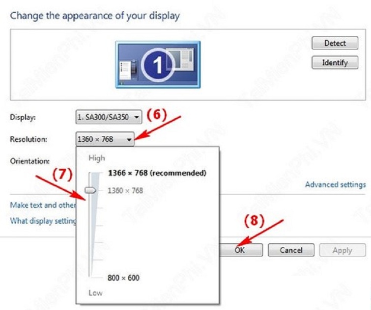- Bước 5: Lúc này trong cửa sổ hiện ra, ở mục Resolution bạn hãy nhấp vào mũi tên trỏ xuống, rồi dùng chuột kéo thanh trượt để chọn độ phân giải màn hình máy tính phù hợp. Cuối cùng, nhấn nút OK để lưu lại quá trình thay đổi.