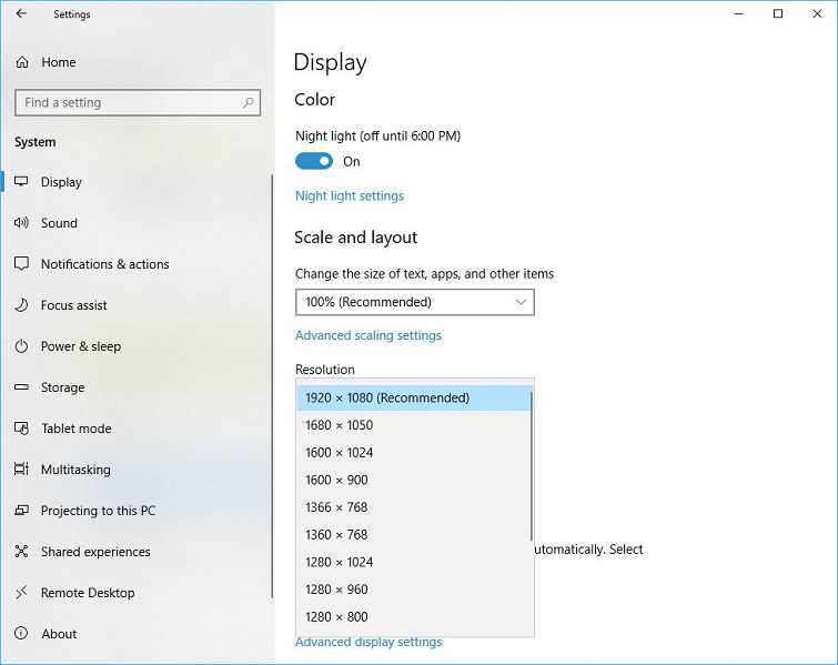 - Bước 3: Tiếp theo, tại danh mục Display sẽ chọn độ phân giải màn hình máy tính mà bạn muốn sử dụng ở bên dưới dòng Resolution phía bên phải.