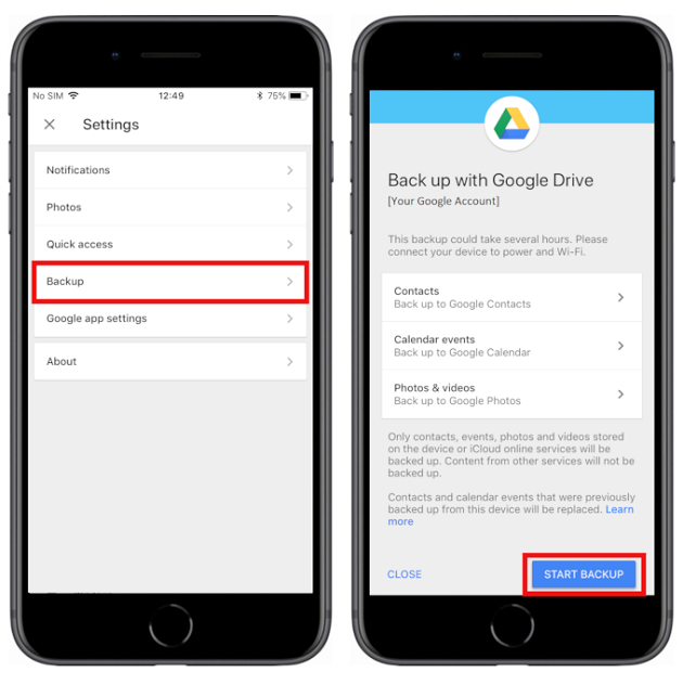 - Bước 4: Chọn các dữ liệu bạn muốn sao lưu: Danh bạ điện thoại, Lịch, Ảnh và video, bằng cách chạm vào nút gạt. Sau đó bạn chỉ cần nhấn "Bắt đầu sao lưu".