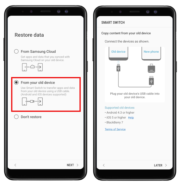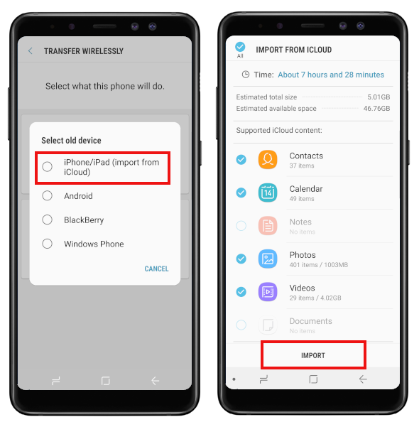 Riêng điện thoại Samsung bạn có hai cách để nhận dữ liệu từ iPhone về máy là sử dụng dây cáp hoặc dùng internet. Tuy nhiên cách dùng mạng không nhận được nhiều dữ liệu như lịch sử cuộc gọi... so với sử dung cáp.