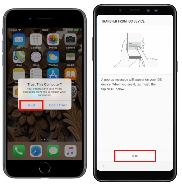 - Bước 5: Nhấn "Tiếp theo" trên điện thoại Samsung và chờ cho đến khi máy hiển thị thiết bị iPhone của bạn. Việc này có thể sẽ mất vài phút. Hãy đảm bảo rằng cả hai thiết bị vẫn được kết nối với cáp cho đến khi quá trình hoàn tất.