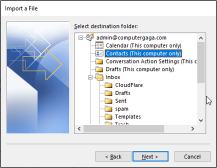 - Bước 5: Chọn Contacts this computer only thư mục Danh bạ trên Outlook để những liên hệ chuẩn bị chuyển sang sẽ nằm ở đây.