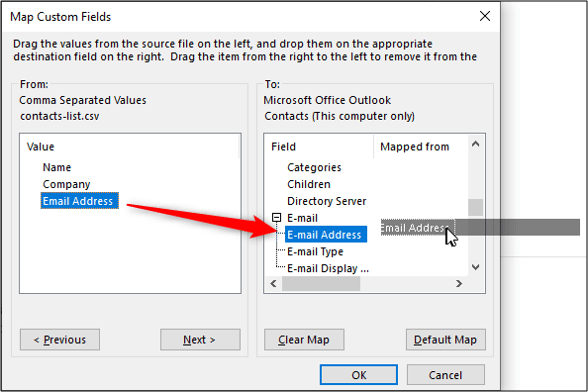 Với những trường không khớp, ví dụ là Email Address trong bảng, bạn click chuột và kéo trường từ From sang To, sau đó chọn OK để hoàn thành bước 7
