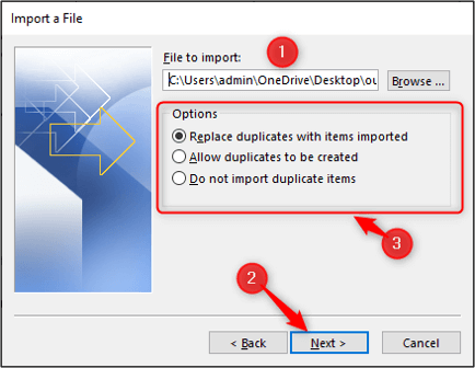 Trong ví dụ này nếu Replace Duplicates with Items Imported, tức là các liên hệ hiện có trong Outlook sẽ bị đè lên bởi thông tin có trong file được import vào.