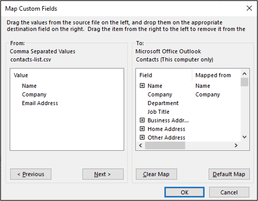- Bước 7: Trong hộp thoại Map Custom Fields mở ra, các trường có trong file CSV sẽ xuất hiện ở bảng From phía bên trái, còn To ở bên phải là các trường từ thư mục Danh bạ trong Outlook.