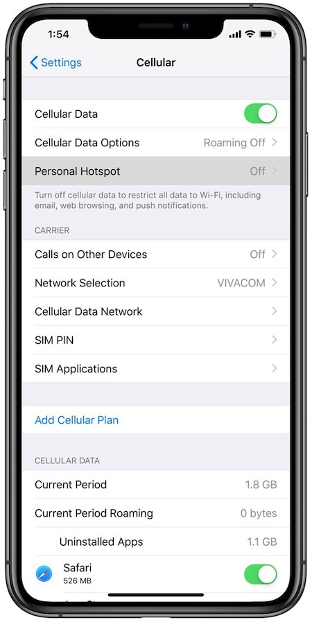 Bước 4: Quay lại mục Cellular. Lúc này bạn sẽ nhìn thấy một thanh Personal Hotspot mới xuất hiện. Bấm chọn nó