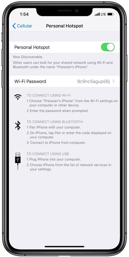 Bước 5: Kéo nút trượt Personal Hotspot sang màu xanh. Bây giờ điện thoại của bạn đã trở thành điểm phát Wi-Fi và các thiết bị khác có thể kết nối thông qua mật khẩu được tự động sinh ra ở phần Wi-Fi password (hình dưới)