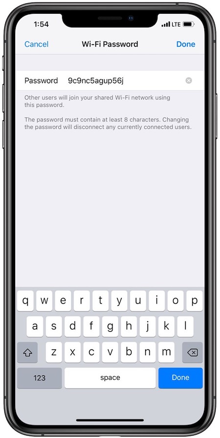 Bước 6: Nếu bạn thấy mật khẩu kết nối quá rắc rối và khó nhớ, bạn có thể đổi mật khẩu này bằng cách bấm vào dấu x để xóa mật khẩu cũ, sau đó gõ mật khẩu mới và bấm Done.