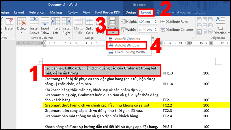 - Bước 3: Chọn 1 ô bất kỳ > Chọn thẻ Layout tại Table Tools > Chọn lệnh AutoFit > Chọn AutoFit Window.