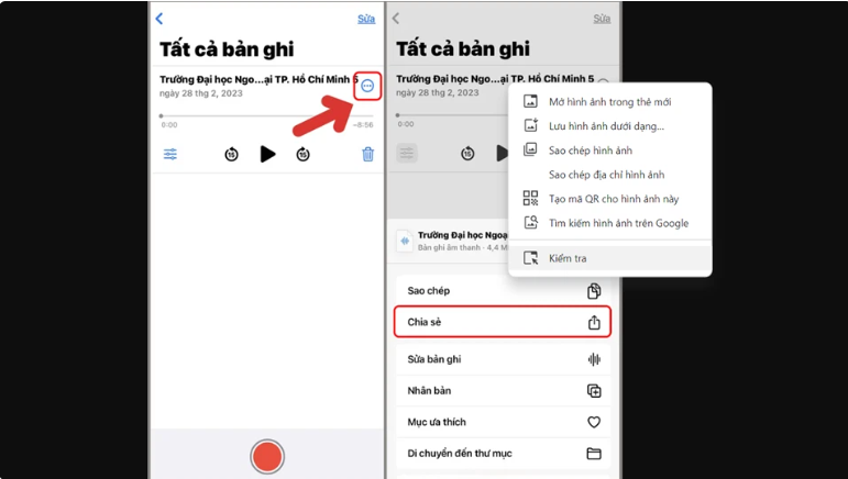 - Bước 1: Bạn hãy mở ứng dụng Ghi âm và chọn biểu tượng ba chấm. Sau đó, tiếp tục chọn "Chia sẻ" từ danh sách tùy chọn.
