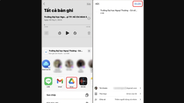 - Bước 2: Tiếp theo, chúng ta cần chọn "Drive" từ danh sách tùy chọn. Bạn hãy chọn "Tải lên" để tải file ghi âm lên Google Drive.