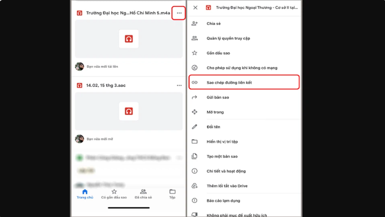 - Bước 4: Tiếp tục thực hiện cách đăng file ghi âm lên Facebook từ iPhone bằng thao tác chọn biểu tượng ba chấm bên góc phải của file ghi âm trên Google Drive. Kế đó, chúng ta cần chọn "Sao chép liên kết" để sao chép liên kết chia sẻ của file ghi âm.