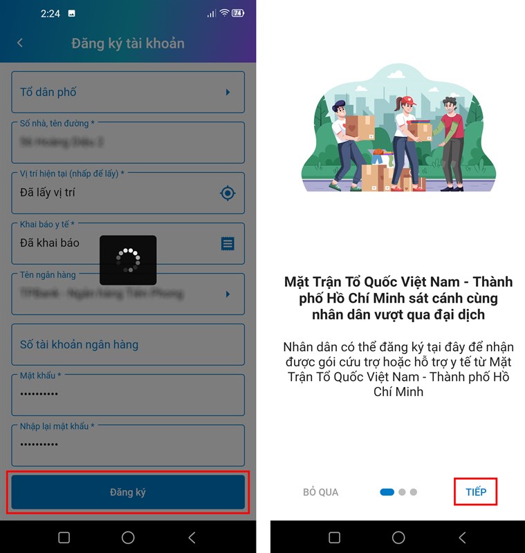 - Bước 3: Mục Tên ngân hàng và Số tài khoản ngân hàng bạn có thể không cần điền cũng được > Nhấn Đăng ký >Thành công, bạn sẽ nhận được lời giới thiệu từ ứng dụng An Sinh > Tiếp.