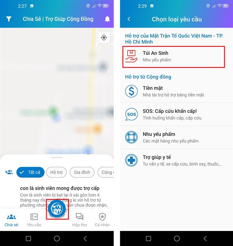 - Bước 4: Tại giao diện chính của ứng dụng, bạn sẽ thấy bản đồ vị trí của mình và các yêu cầu hỗ trợ của người dân. Để đăng ký nhận túi an sinh từ Trung tâm an sinh Thành phố Hồ Chí Minh, bạn nhấn vào nút Yêu cầu > chọn Túi An Sinh.