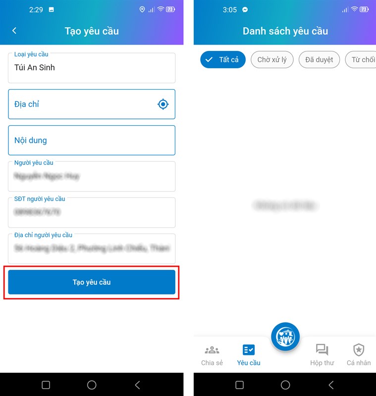 - Bước 5: Bạn điền đầy đủ các thông tin đăng ký nhận gói an sinh xã hội, nhấn Tạo yêu cầu. Quay lại màn hình chính ứng dụng, tại mục Yêu cầu, bạn có thể theo dõi tiến độ gói yêu cầu an sinh của mình.