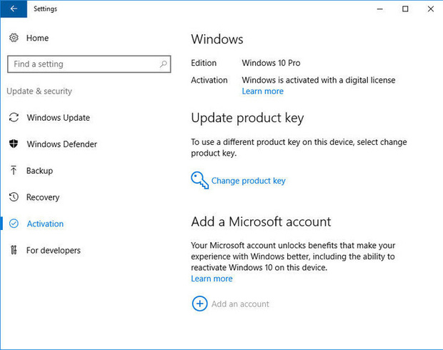 Lúc này, PC của bạn sẽ tiến hành tải về và nâng cấp lên Windows 10. Khi quá trình nâng cấp hoàn thành, hãy kiểm tra tình trạng kích hoạt bằng cách vào Settings > Update & Security > Activation. Nếu tất cả mọi thứ ổn thoả, bạn sẽ thấy Windows 10 đã được kích hoạt sẵn với "bản quyền điện tử" (digital license).