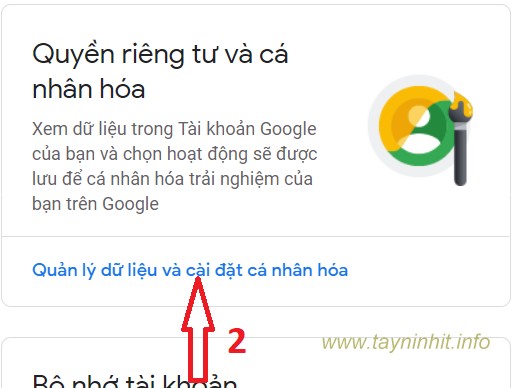- Bước 2: Lúc này chuyển sang giao diện thiết lập quản lý cho tài khoản Google của bạn. Chọn Quản lý dữ liệu và cài đặt cá nhân hóa trong phần Quyền riêng tư và cá nhân hóa.