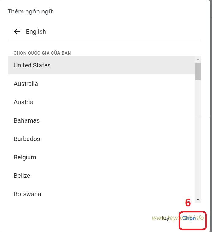 Bên dưới sẽ xuất hiện ngay tùy chọn quốc gia phù hợp với ngôn ngữ đó > Chọn để lưu lại
