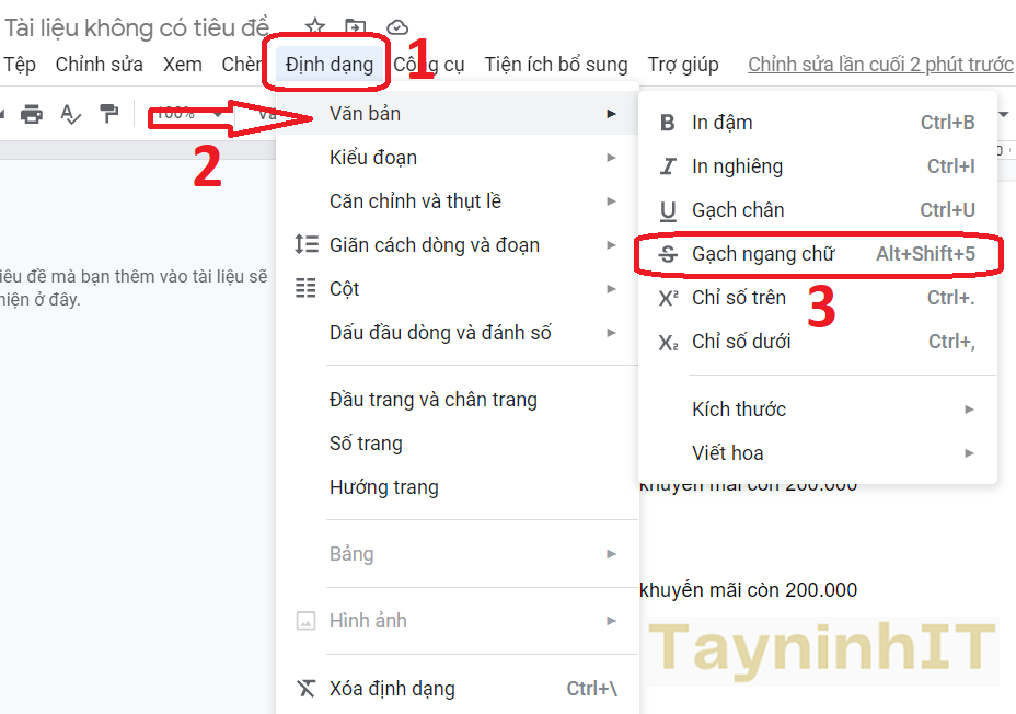 - Bước 2: Bôi đen phần văn bản cần gạch ngang > Định dạng ( Format ) > Văn bản ( Text ) > Gạch ngang chữ ( Strikethrough )