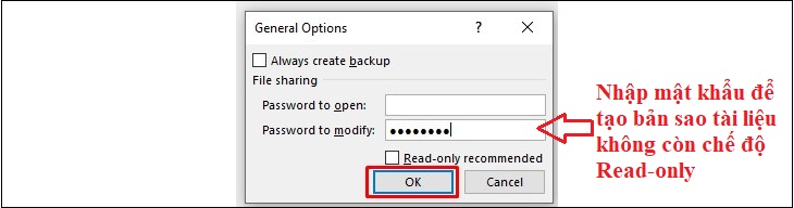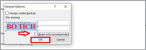 Bước 3: Hộp thoại General Options xuất hiện, chỉ cần bỏ đánh dấu Read-only recommended. Sau đó bấm chọn OK.