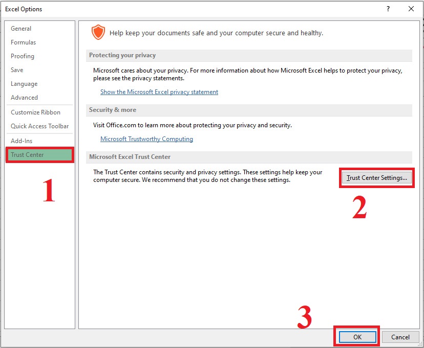 Bước 2: Cửa sổ Options hiện lên, chọn thẻ Trust Center > Trust Center Settings > OK.