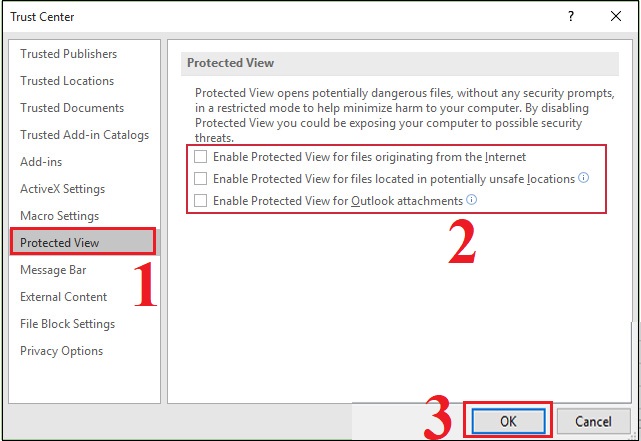 Bước 3: Cửa sổ Trust Center xuất hiện > Protected View > bỏ dấu tích ở 3 ô như mô tả trong ảnh dưới xong > Nhấn OK để lưu lại.