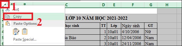 Bước 1: Trên giao diện màn hình của file Excel > Nhấn vào mũi tên nghiên bên góc trái màn hình để chọn tất cả dữ liệu (Hoặc nhấn chọn tổ hợp phím Ctrl + A) > Nhấn chuột phải chọn Copy (hoặc nhấn chọn Ctrl + C) để sao chép dữ liệu.