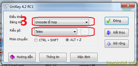 Bước 2: Mở phần mềm gõ tiếng việt Unikey -> chọn tiếp bảng mã Unicode tổng hợp -> kiểu gõ ( ở đây tayninhit chọn kiểu gõ Telex),