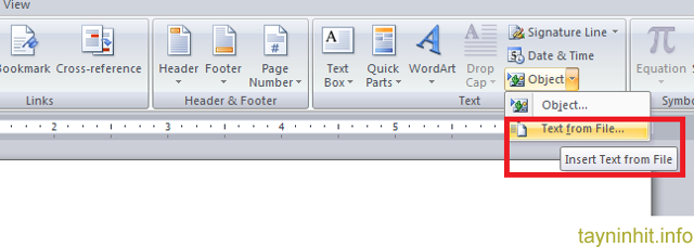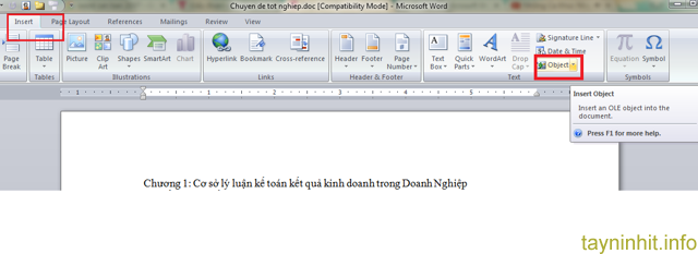- Bước 1: Muốn gộp nhiều văn bản lại với nhau chúng ta vào tab Insert --> click mũi tên sổ xuống bên phải Object