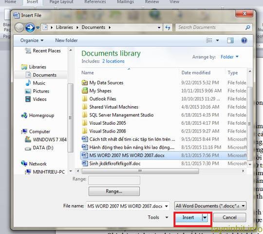 - Bước 2: Hộp thoại Insert File xuất hiện, bạn tìm đến file cần chèn, chọn và nhấn Insert. Nội dung file vừa chọn lập tức xuất hiện ngay tại vị trí bạn đặt trỏ chuột. Chọn tiếp các file khác và lặp lại các bước trên để có được một file hoàn chỉnh như mong muốn.