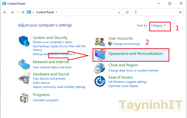 - Bước 2: Cửa sổ Control Panel hiện lên. Vào Phần Appearance and Personalization.