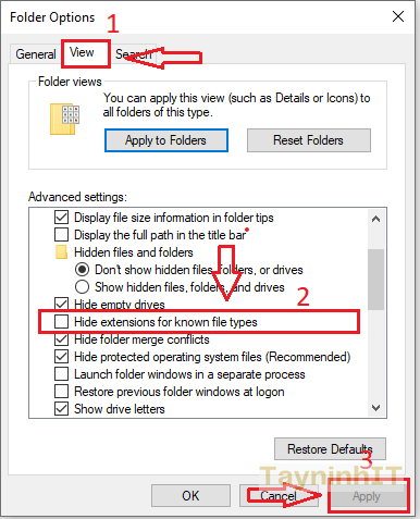 - Bước 4: Trong hộp thoại Folder Options chọn thẻ View. Click bỏ chọn "Hide extensions for known file types" . Sau đó click Apply rồi OK. Vậy là đã xong.