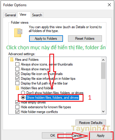 - Bước 4: Trong hộp thoại Folder Options chọn thẻ View. Click chọn "Show hidden files, folder, and driver" . Sau đó click Apply rồi OK. Vậy là đã xong.